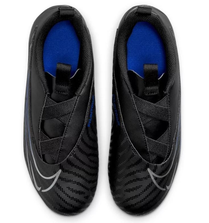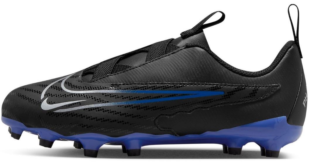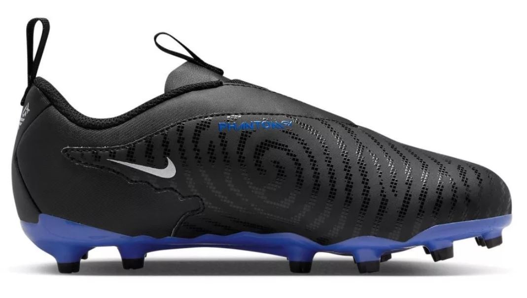 Las Nike JR Phantom GX Academy DF FG/MG presentan un diseño completamente negro con detalles en plata y azul, la suela combina tacos cilíndricos y triangulares para ofrecer una mayor tracción sobre el terreno de juego, el material sintético con la que esta fabricada ofrece un gran ajuste al pie y un suave golpeo de balón además de no llevar cordones para ofrecer una superficie limpia de golpeo con el balón.