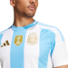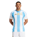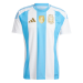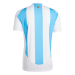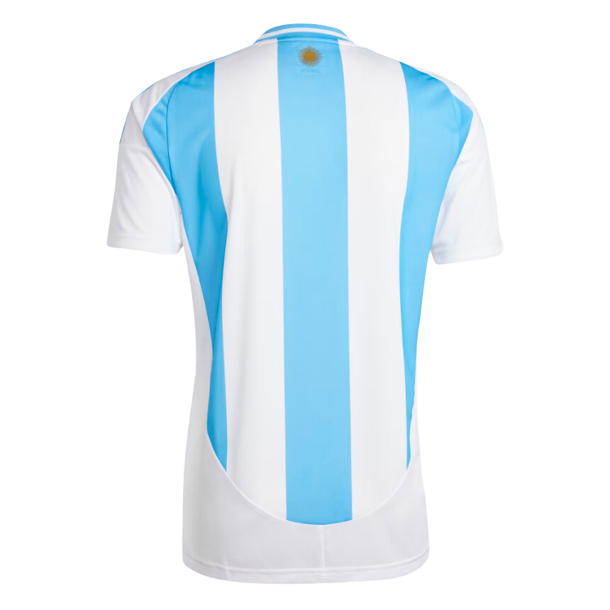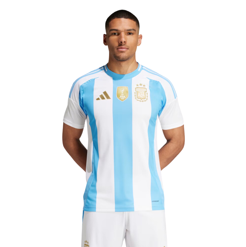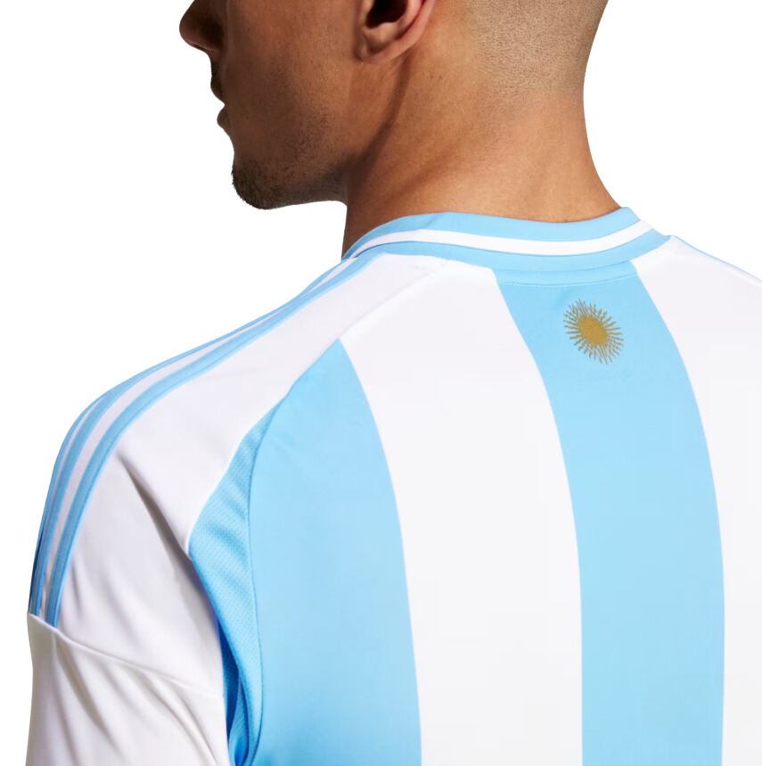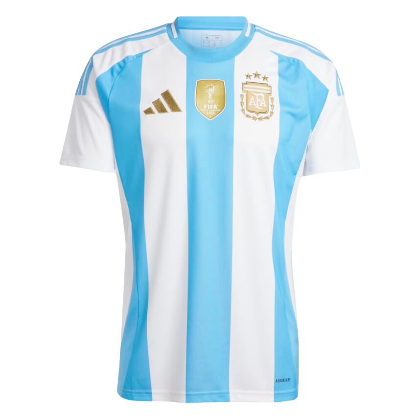 Primera equipación de la Selección Argentina con un diseño de estilo clásico de bandas anchas color celeste y blanca como la bandera de su pais. El parche de campeón del mundo en el centro del pecho lo llevaran con orgullo desde su épica victoria en Qatar. Los detalles y el escudo se encuentran en color dorado como homenaje a sus ultimas competiciones en las que se han coronado campeones.
