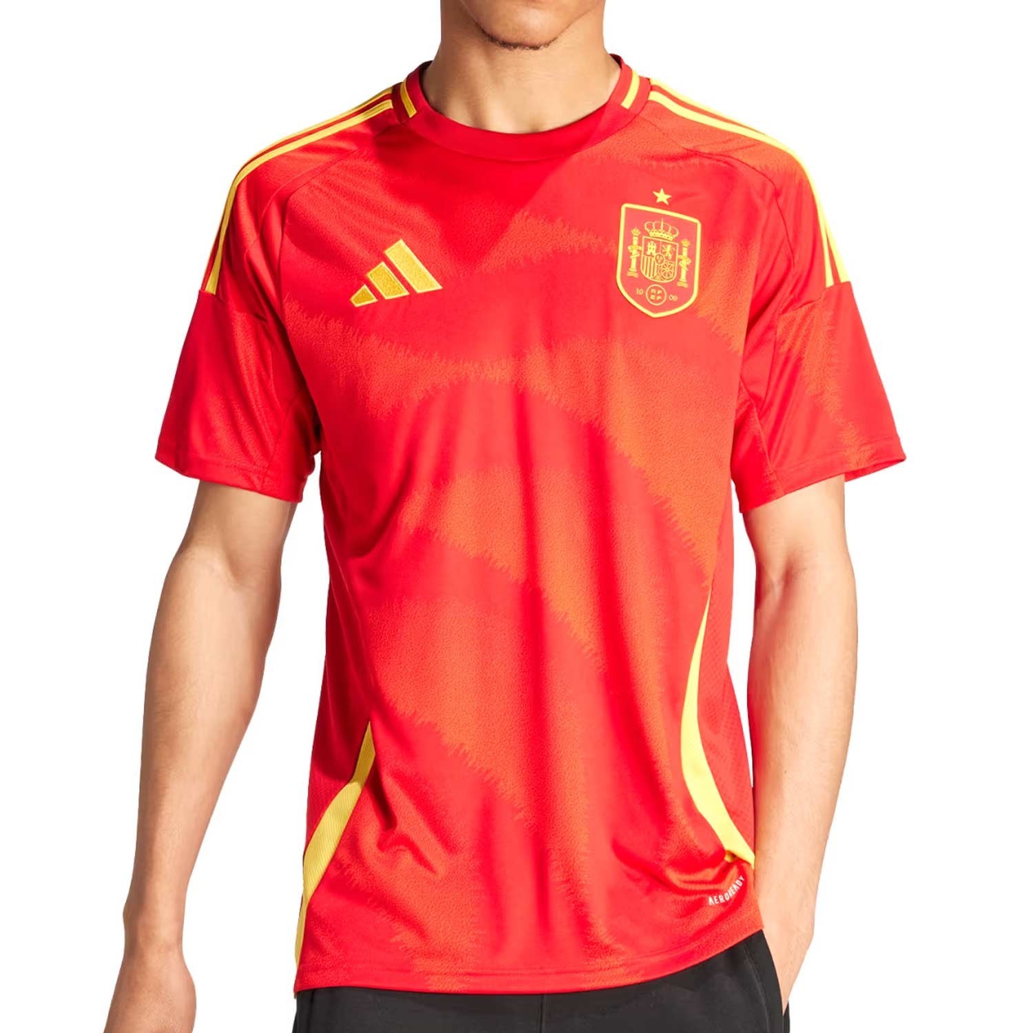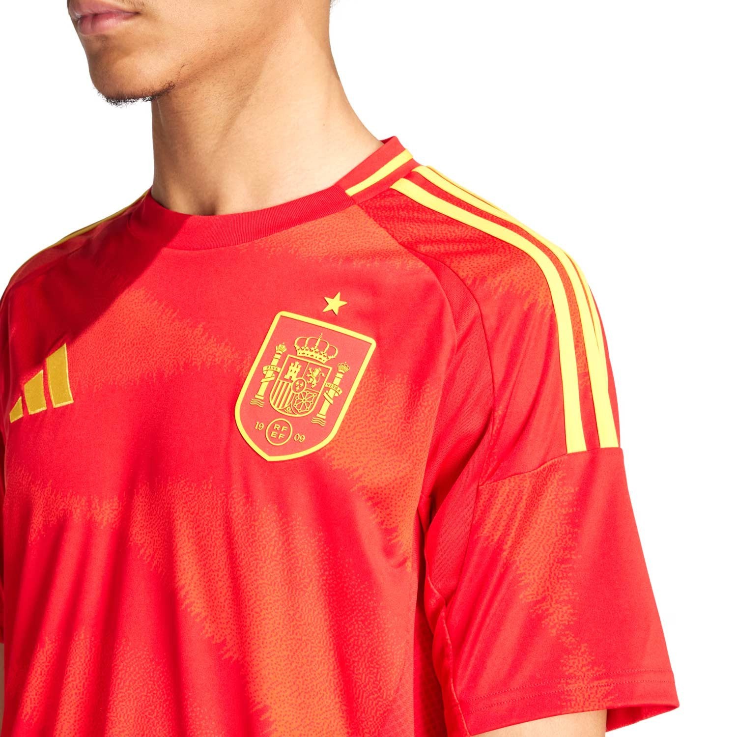 Nueva camiseta de la selección Española de fútbol que portaran para la Eurocopa 2024, su diseño esta inspirado en la belleza de España que podemos encontrar en las olas que recorren toda la camiseta en distintas tonalidades de rojo y el clavel como flor nacional colocado en la zona de la nuca. Sus famosos colores rojo y amarillo, sinónimo de talento y compromiso, son ya parte de la historia del fútbol.
