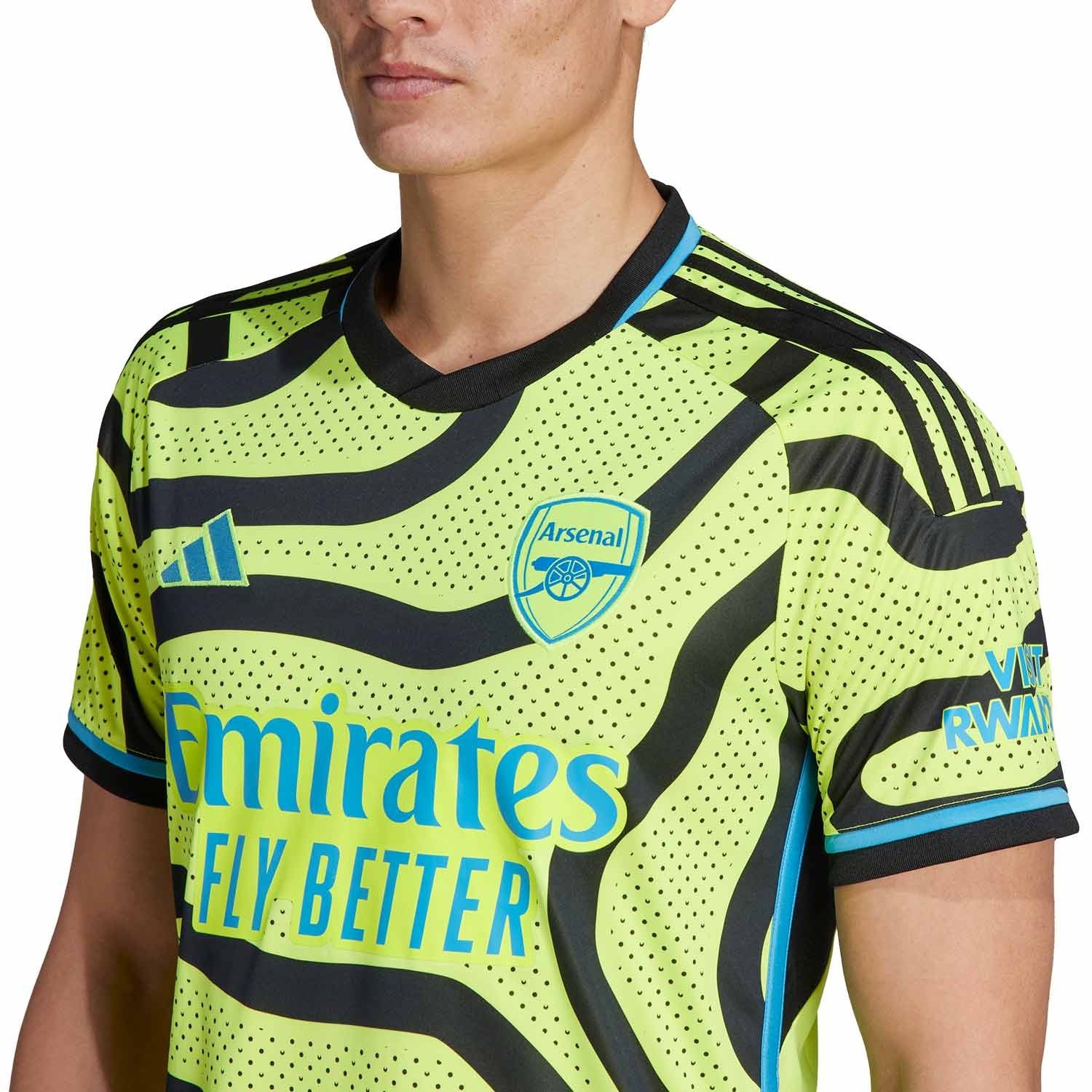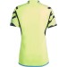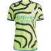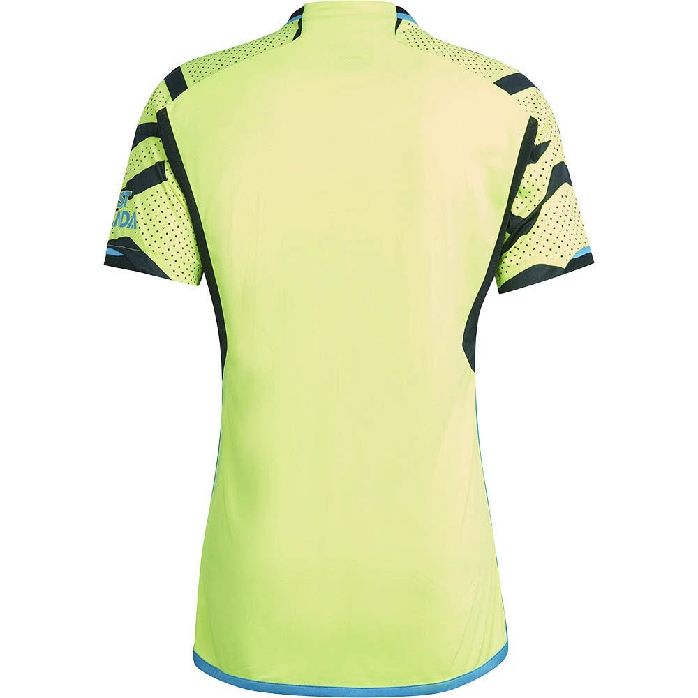 Segunda equipación del Arsenal FC para la temporada 23/24, diseñada en un llamativo color amarillo flúor con detalles en azul claro y negro. Lineas onduladas acompañan el diseño de la camiseta que representa la marea de seguidores que sigue a los Gunners a todas partes del mundo.