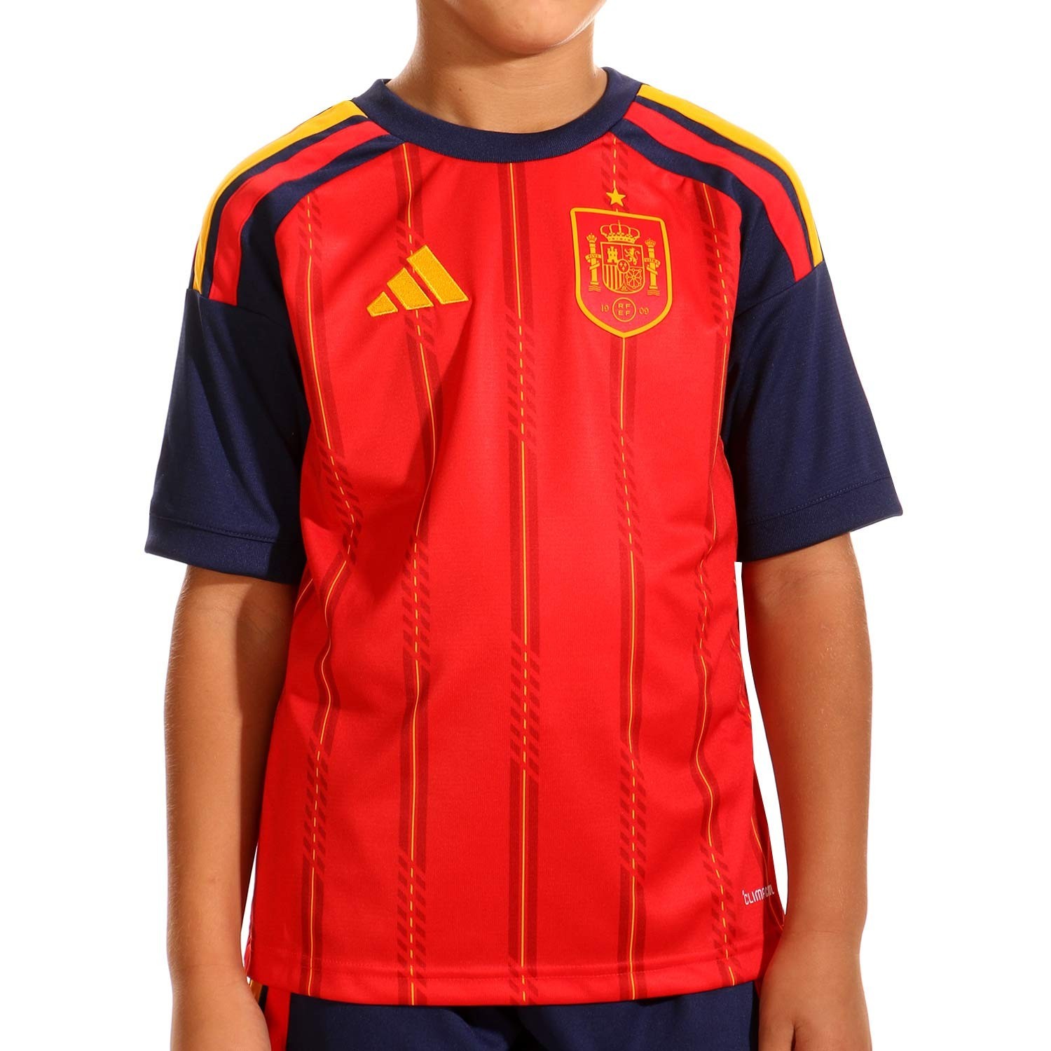 Su diseño icónico en rojo intenso acompañado de detalles amarillos y azul marino rinden homenaje a la bandera nacional. El escudo de la RFEF late en el pecho, mientras que el logo de Adidas destaca con un acabado premium.