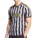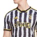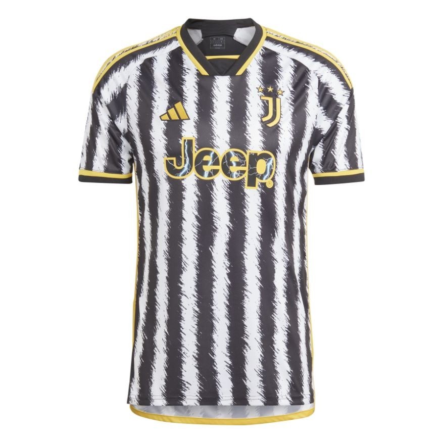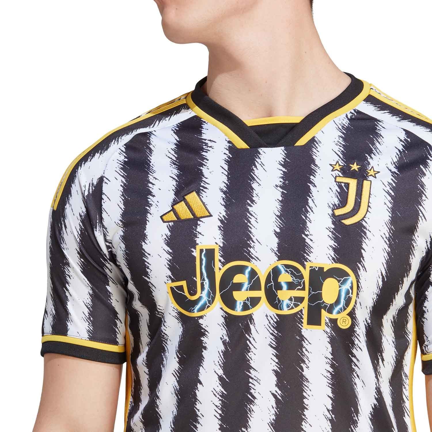 Nueva primera equipación para la Juventus de Turin para la temporada 23/24, su diseño como nos tiene acostumbrados es con lineas verticales blancas y negras pero con la particularidad de que tienen un ligero movimiento como pinceladas hacia los lados, los detalles los encontramos en un potente color amarillo.