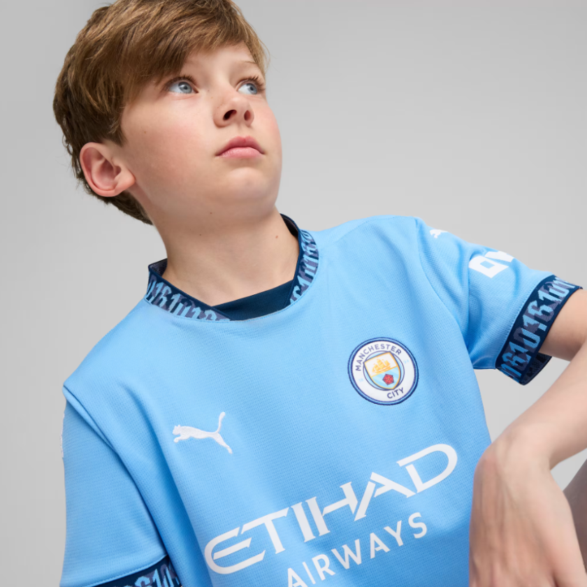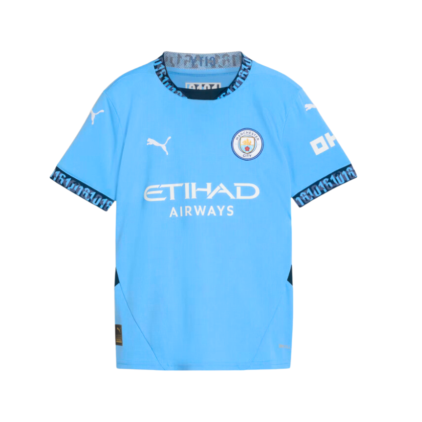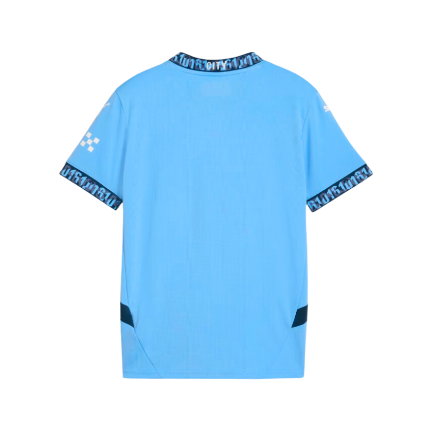 Nueva camiseta Puma diseñada para el Manchester City temporada 2024-25. Siguiendo fiel a su estilo tenemos una camiseta completamente color azul celeste con la incorporación de bandas azul marino en cuello y mangas.