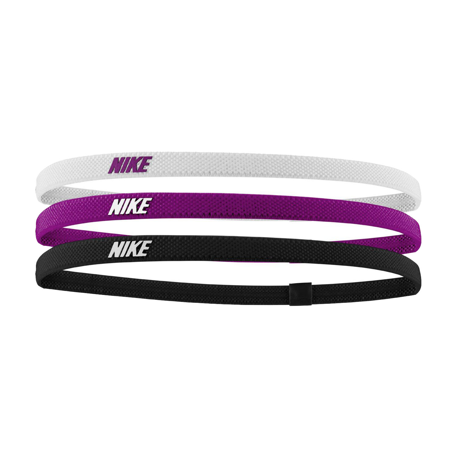 Cintas para el pelo Nike HEADBANDS 2.0 con un grosor y tamaño ideal para sostener el cabello y no incomodar. Pack que incluye 3 unidades de color Negro, Blanco y Lila.
