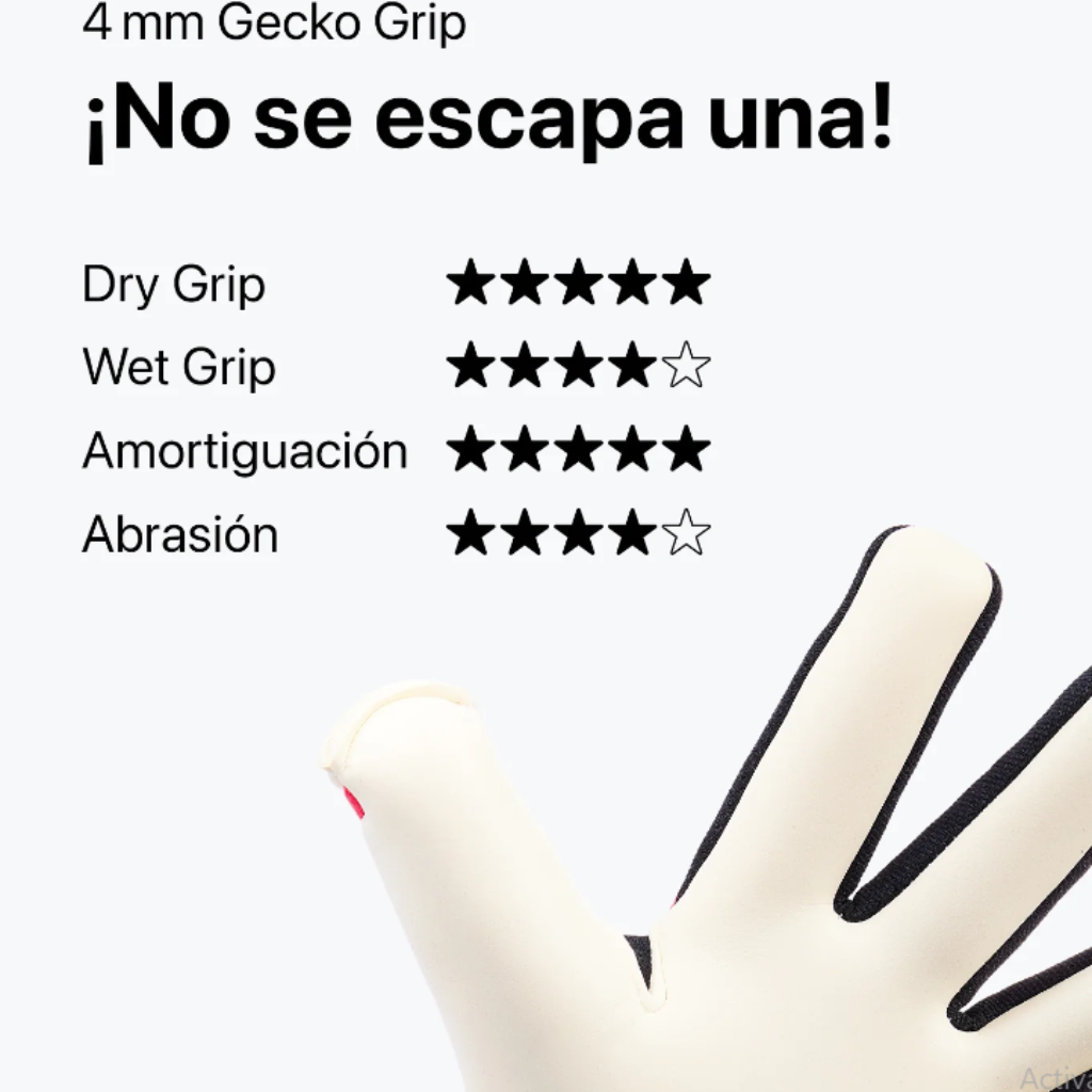 El corte hibrido maximiza la zona de agarre y contacto con el balón permitiendo así el mejor control posible en todo momento. El látex super adherente "Grip Gecko" absorberá el impacto gracias a sus 4mm de espesor y dejara el balón pegado a tu mano con un grip extremo.