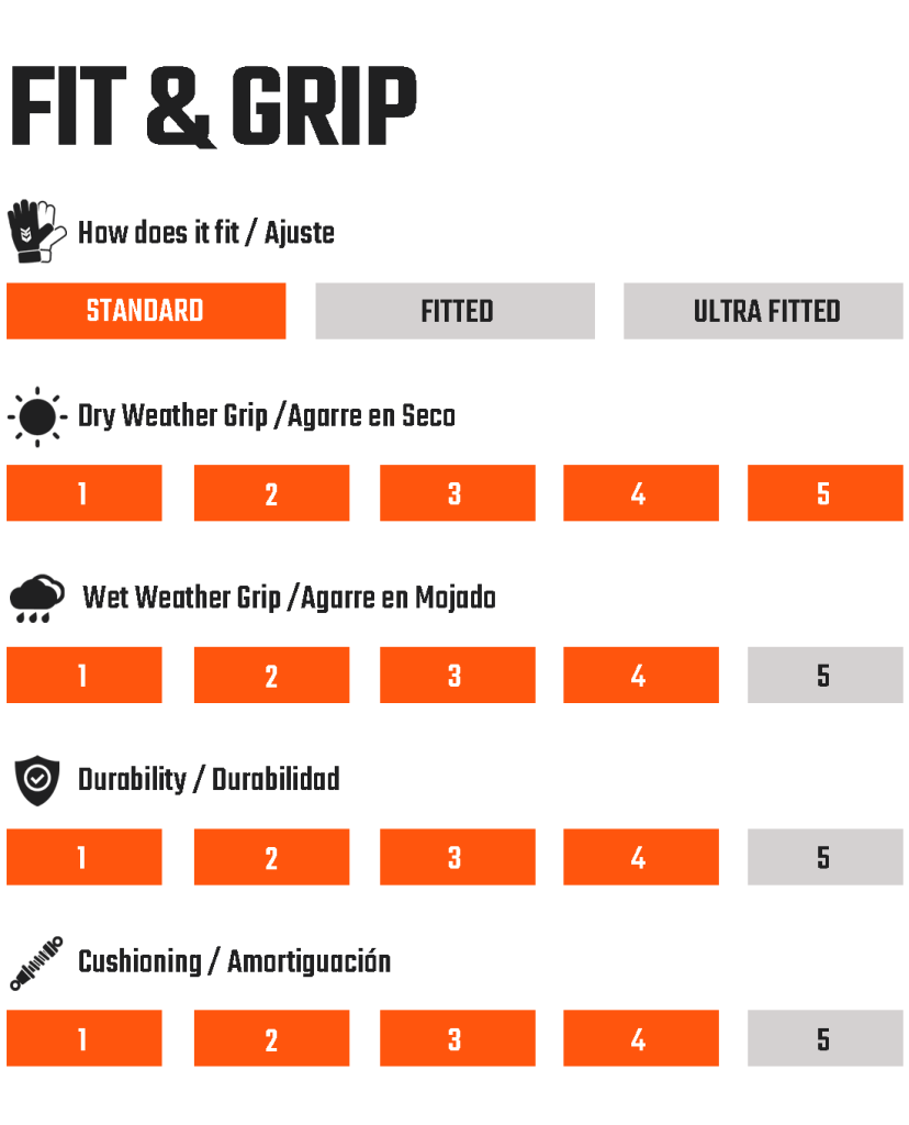 Palma de alto rendimiento y de gran durabilidad que nos ofrece un optimo agarre en todas la condiciones climáticas. 4mm de Latex alemán ContactGrip+ que junto con otros 4mm de la espuma Memory Foam logran una gran amortiguación y un agarre ideal por toda la mano.
