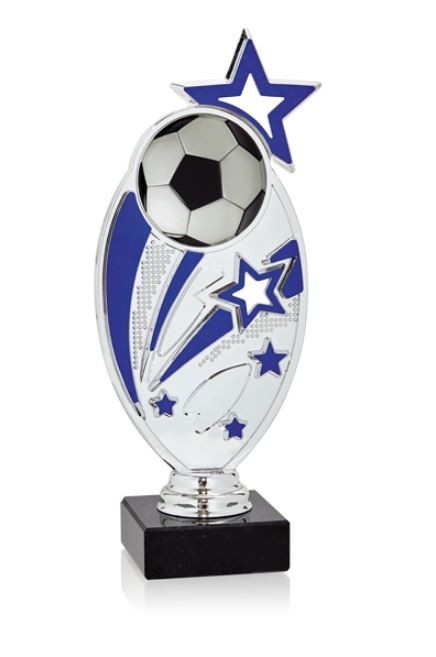 Trofeo de ABS Metalizado, color gris metalizado con detalles en azul royal, tamaño de 20 cm ideal para colocar en tu lugar favorito.