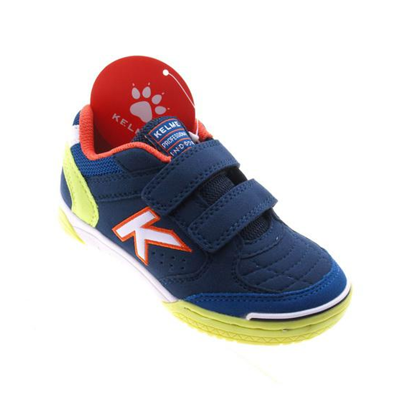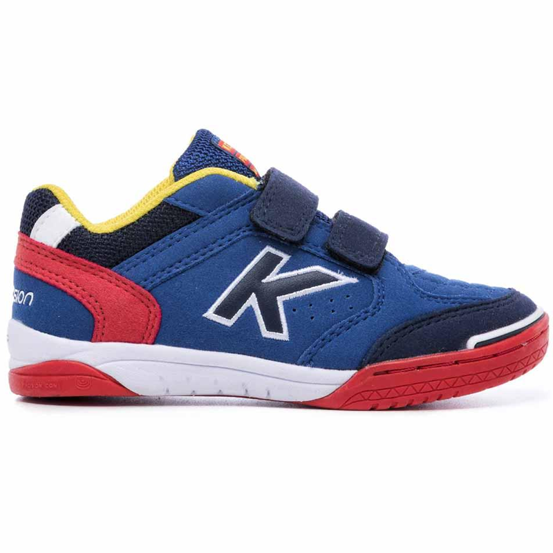 Zapatillas de fúbtol sala para los niños con cierre de velcro y disponible en 2 colores ,azul rojo muy atractivo y también azul y amarillo . Se compone un diseño clasico de Kelme
